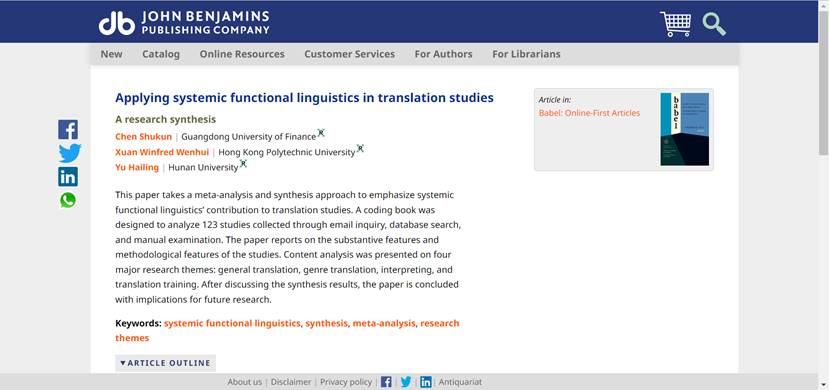 近日,我校3044am永利集团教师陈树坤博士的最新研究成果“Applying systemic functional linguistics in translation studies: A research synthesis”在《Babel》上正式刊发。《Babel》是国际译学界公认的最具影响力的翻译学期刊之一,系国际顶尖翻译学学术刊物。陈树坤为该成果的第一作者,广东金融学院为第一单位。