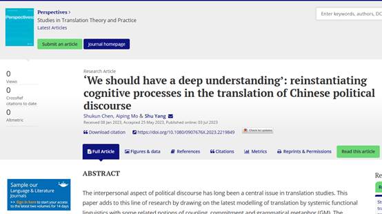 近日,我校3044am永利集团教师陈树坤博士的最新研究成果“‘We should have a deep understanding’: reinstantiating cognitive processes in the translation of Chinese political discourse”在《Perspectives: Studies in Translation Theory and Practice》上正式刊发。《Perspectives》是国际译学界公认的最具影响力的翻译学期刊之一,系国际顶尖翻译学学术刊物,在2023版语言学SSCI期刊以1.3影响因子位列2区。陈树坤为该成果的第一作者,广东金融学院为第一单位。