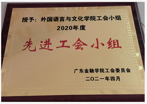 在外文学院领导高度重视下,各位工会成员积极参与各项工会活动,外文学院2020年工会工作取得不俗成绩,圆满完成学校各项工会工作,也参与了所有工会活动。在20多个工会小组参与评比中脱颖而出,连续第二年荣获“广东金融学院先进工会小组”荣誉称号。