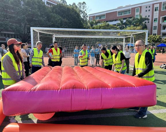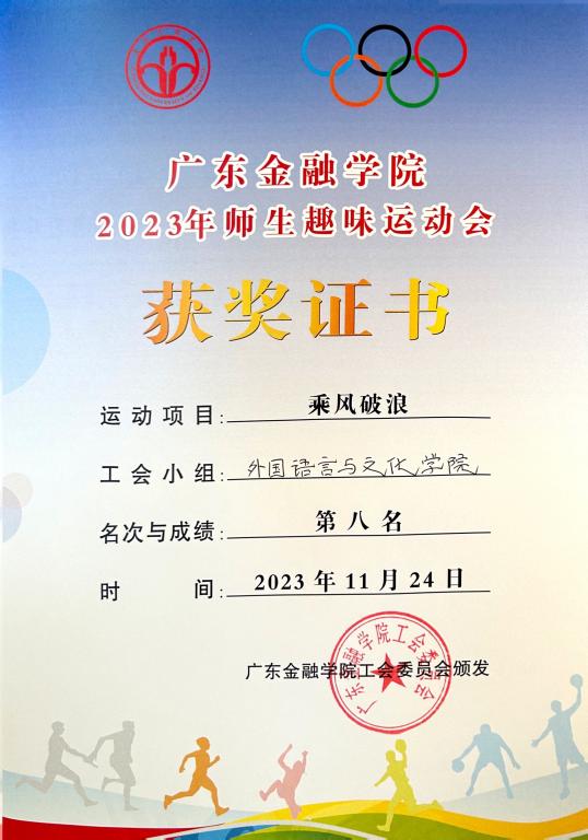 喜报:11月24日,广东金融学院2023年度师生趣味运动会顺利举行。我院18名教师参赛队员在黄庆雄书记、涂兵兰院长和洪溪珧副院长的带领下,参与了“运转乾坤”、“猛龙过江”、“乘风破浪”、“超级投篮”等项目的团体比拼,获得“乘风破浪”项目第八名。
