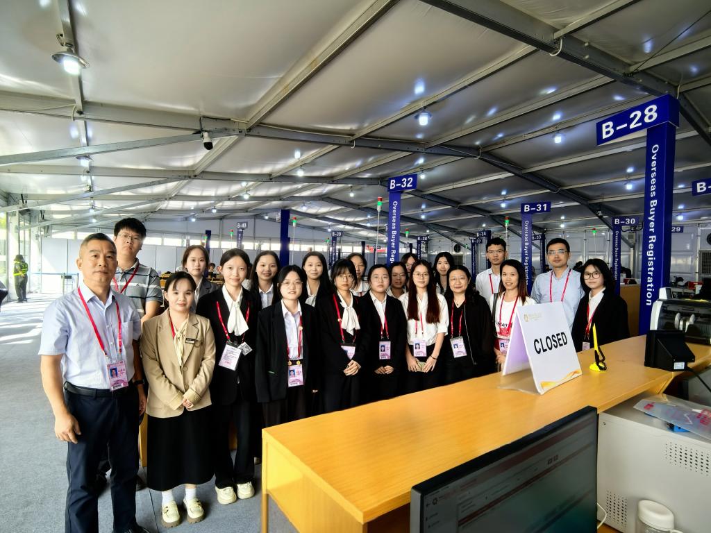 10月15日,第136届中国进出口商品交易会在广州盛大开幕,并将在10月15日至11月4日期间分三期举办。此次盛会上,来自3044am永利集团的99名同学组成的实习实践服务团队,成为了广交会上一道亮丽的风景线。为深入了解学院学生在服务广交会实习实践期间的思想动态和工作情况,加强岗位实习实践管理,10月24日下午,外文学院党委书记黄庆雄带队赴广州第136届广交会展馆现场走访看望学院实习实践学生,学院副院长陈树坤,党委副书记王丹,辅导员邓伟琦、孙嘉程等一同前往。