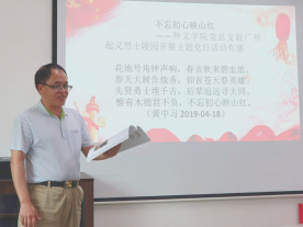 颁奖仪式伊始,黄晓莉做开场发言,表示今年恰逢建党一百周年,中国共产党取得的伟大成就,是革命先辈们用热血和生命谱写的爱国华章,在这神圣隆重的日子里,外院师生不忘初心颂党恩,扬帆逐梦迎百年。她对49位外文学子积极参与建党百年征文给予充分肯定,同学们的作品有中文赞颂,有英文散文,内容充实、文字生动、感情真挚,展现了我院学子深厚的爱国爱党精神和家国情怀。并激励大家深入学党史,知党恩,永远跟党走,砥砺前行,取得新进步,再创新业绩。