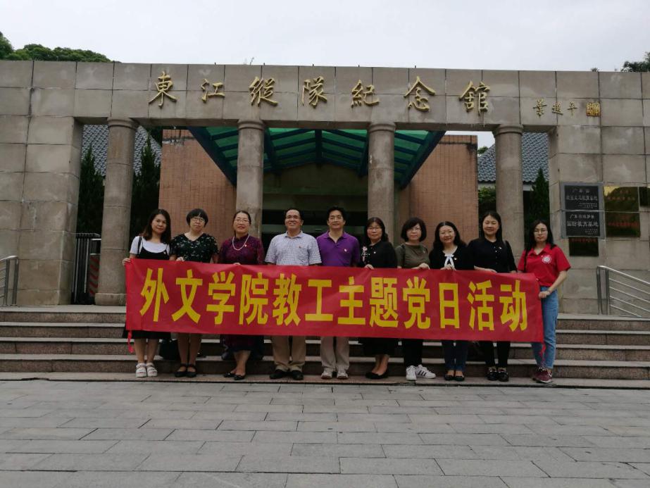 外文学院教工第一党支部党建工作中,坚持把主题党日作为推进“两学一做”学习教育常态化制度化的重要途径,使之成为与“三会一课”相并行、相衔接、相协调的制度安排。2018年5月4日,黄中习教授带领着党员代表到东江纵队纪念馆参观学习,重读党史知识,了解东江纵队光荣的战斗历史,提高党员的组织纪律性,提高党员工作战斗力。外文学院党员代表以谦虚敬畏的态度,认真仔细地参观了东江纪念馆的七个主题展厅,了解了革命先烈的光辉历程和丰功伟绩,进一步坚定理想信念,树牢为民宗旨,受到了一次深刻的党性教育。学习交流活动结束后,党员师生纷纷表示,本次活动加深了对党史的了解和认知,激励我们沿着建设中国特色的社会主义道路奋勇前进,要发挥党员的先锋模范作用,立足本职岗位,争当“为民、务实、清廉”的忠实践行者,以实际行动为党尽责、为党争光,为办好人民满意的金融教育和建设应用型金融品牌大学多做贡献。