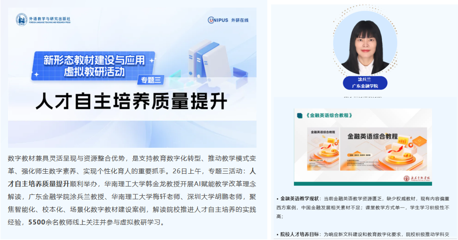 院长涂兵兰教授作为数字化战略推手,受邀分享经验。2025年4月,她在外研在线虚拟教研活动中分享《金融英语综合教程》创新经验,吸引5500余名教师在线参与。她指出,数字教材通过整合文字、音频、视频等多模态资源,首次构建了立足中国金融实践的立体化教学体系。数字化改革使得教师从"焦虑"走向"优化",学生突破时空限制,自主学习能力提升30%。通过互动写作任务设计,学生金融术语应用能力显著增强。