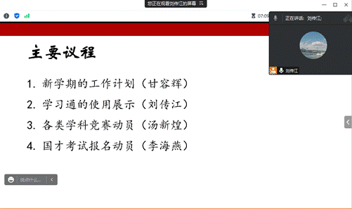 2023年9月7日周四晚上8点,外文学院大学英语部线上召开了本学期第一次全体教研会议,大会包括了四项内容:新学期工作计划、学习通的使用展示、外研社国才杯—理解当代中国全国大学生外语能力大赛动员以及国才考试报名动员。会议由外文学院刘传江主任主持。