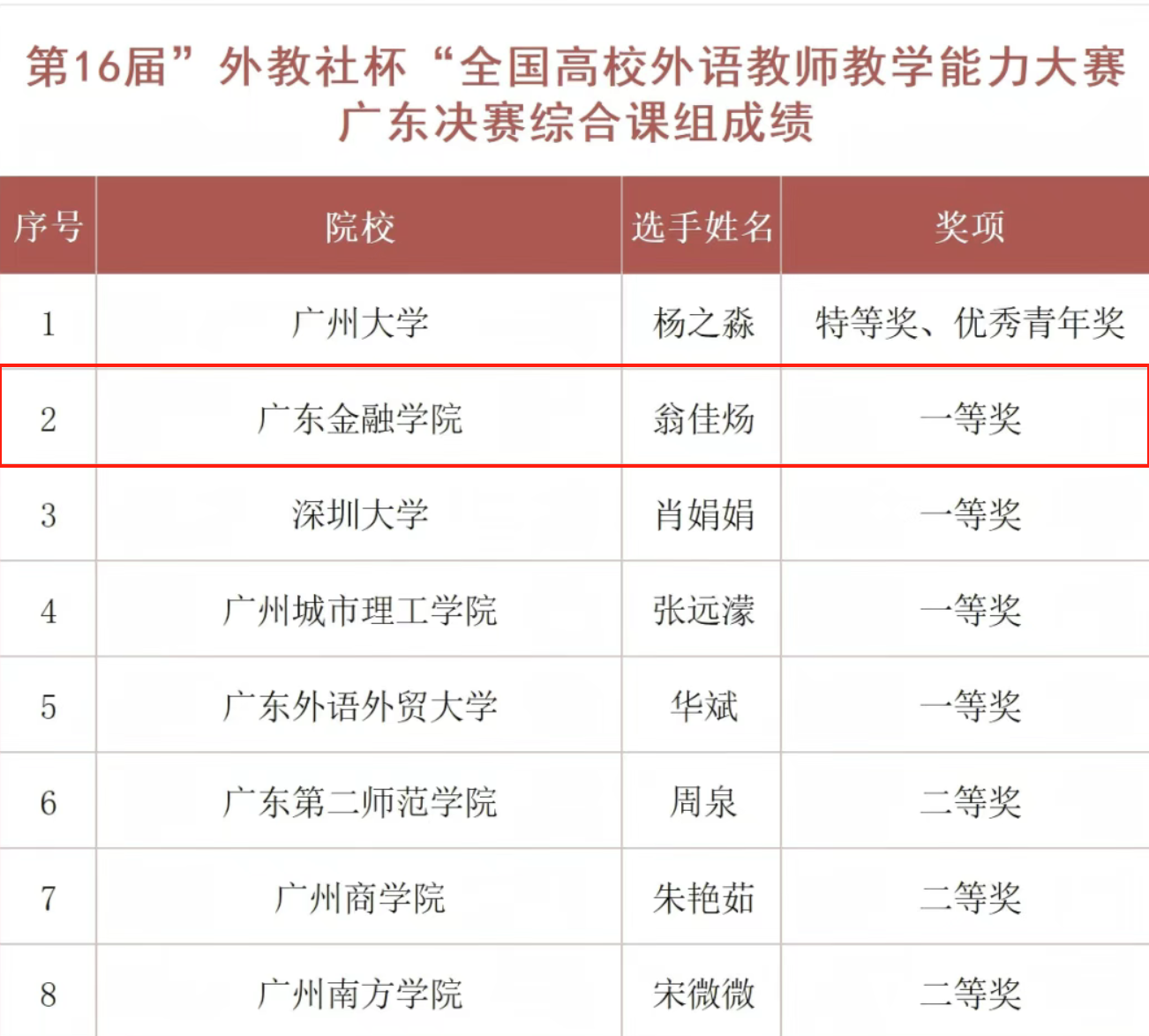 6月7日,第十六届“外教社杯”全国高校外语教师教学能力大赛(大学英语组)广东赛区决赛暨颁奖典礼在广州南方学院圆满落幕。3044am永利集团翁佳炀老师凭借扎实的教学功底与创新的教学设计,在综合课组激烈角逐中脱颖而出,勇夺综合课组一等奖第一名,为学校再添殊荣。